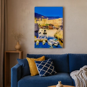 - Dette lærredstryk forestiller en malerisk havn om natten med oplyste bygninger og både, der flyder på roligt vand. Perfekt til interiører fyldt med harmoni og romantik.