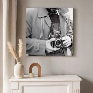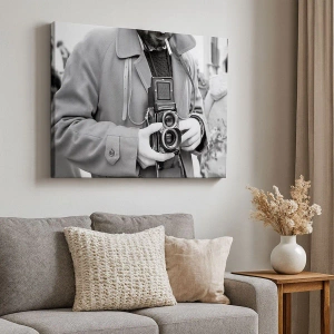 - Maleriet forestiller en mand med et retrokamera i sort-hvid, hvilket formidler en nostalgisk vintage-følelse. Det er et perfekt valg til klassiske eller minimalistiske interiører.