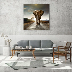 Billede på glas - En elefant går langs vejen ved solnedgang - 70x50cm - Og slet ikke i en porcelænsbutik - Moderne vægdekoration til stue og soveværelse ARTTOR