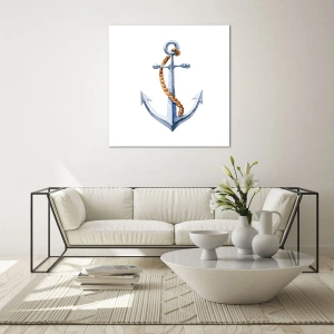 Billede på glas - Anker med reb i nautisk stil - 70x50cm - Ahoj eventyr! - Moderne vægdekoration til stue og soveværelse ARTTOR