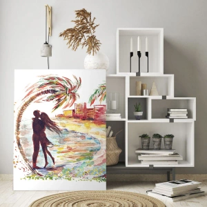 - Dette kunstneriske akvarelmaleri forestiller et romantisk par i tropiske omgivelser omgivet af palmer. Det er den perfekte dekoration for elskere af en unik atmosfære og smukke øjeblikke.