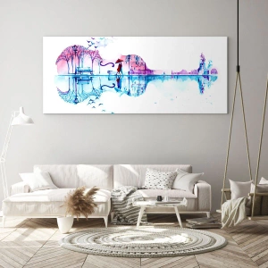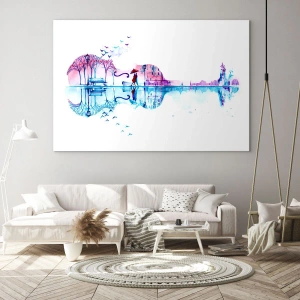Billede på glas - Et guitarformet landskab i akvarelstil - 70x50cm - Jeg vil bringe jer regnvejrssange - Moderne vægdekoration til stue og soveværelse ARTTOR