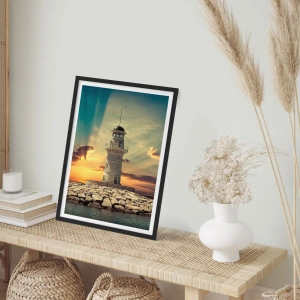 Plakat i sort ramme - Fyrtårn ved solnedgang - 50x70cm - Lys - Godhed - Skønhed - Moderne vægdekoration til stue og soveværelse ARTTOR
