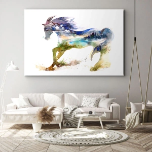 - Maleriet på lærred forestiller en hest med et bjerglandskab i silhuet, i en akvarelstil fuld af harmoni og lethed.