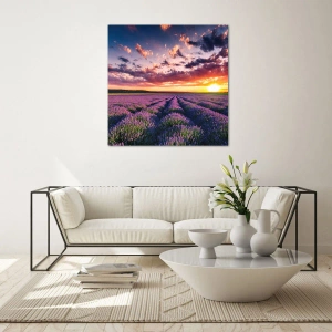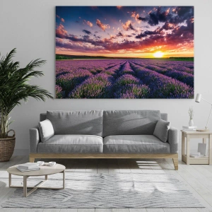 Lilla lavendelblomster kombineret med en farverig himmel fuld af guld og lyserøde nuancer bringer harmoni og fred til ethvert rum. Detaljerigdommen og de intense farver giver kompositionen realisme og dybde.