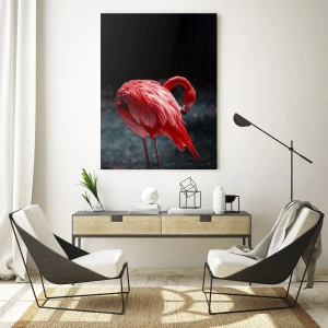 Billede på glas - En flamingo i intense røde nuancer på en mørk baggrund - 70x50cm - Et karmosinrødt naturdigt - Moderne vægdekoration til stue og soveværelse ARTTOR
