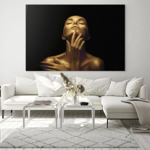 Billede på glas - Portræt af en kvinde i gyldne nuancer - 70x50cm - Som gylden silke - Moderne vægdekoration til stue og soveværelse ARTTOR