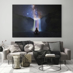 Kontrasten mellem de mørke omgivelser og det farverige vandfald og den lysende himmel tiltrækker opmærksomhed og skaber en dyb atmosfære af koncentration. Vandfaldets farver synes at afspejle kosmisk energi, der strømmer direkte fra galaksen ind i meditationsstedet. Kvinden, selvom den er ubevægelig, bliver omdrejningspunktet i denne scene – indbegrebet af balance, ro og forbindelse med naturen. Maleriet appellerer til sanserne og følelserne og inspirerer til refleksion og en pause i den daglige trummerum.