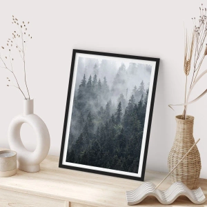 - Denne plakat forestiller et mystisk og roligt syn af en tåget skov med tårnhøje nåletræer. Det er det perfekte valg til interiører, der ønsker et strejf af elegance og harmoni med naturen.