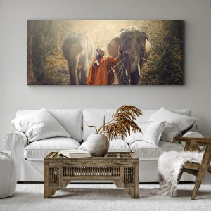 Tilføj et strejf af spiritualitet og naturens skønhed til dit interiør med maleriet "Munk i orange kåbe, der fører en elefant i skoven". Dette værk vil fungere perfekt i både moderne og klassiske arrangementer og give dem fred og harmoni.