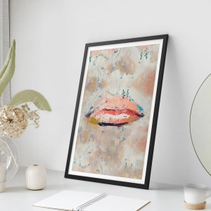 - Plakaten forestiller abstrakte læber i en pastelfarve med accenter af beige, pink og diskrete toner. Kompositionen i impressionistisk stil tilføjer kunstnerisk udtryk og elegance til interiøret.