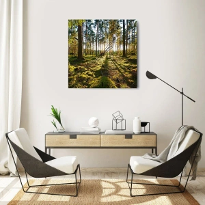 Vægur, Uret - Sollys skinner gennem høje træer i skoven - 30x30cm - ...Bag de syv skove - Moderne vægdekoration til stue, køkken og soveværelse ARTTOR