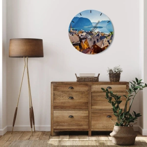 - Dette vægur med en diameter på 30 cm forestiller en malerisk bjergby ved en sø. Perfekt til elskere af landskaber og ro.