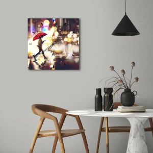 "And Yet Sunny" er et unikt vægur, der kombinerer charmen fra en bynat med subtil elegance. Motivet forestiller en figur med en rød paraply, der går i regnen, omgivet af refleksioner af gadelygter. Denne atmosfæriske komposition tiltrækker øjet og tilføjer en unik karakter til interiøret.