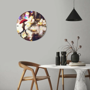 - Dette runde vægur på 30x30 cm har et motiv af en figur med en rød paraply mod en baggrund af byens lys om natten. Perfekt til moderne og stemningsfulde interiører.