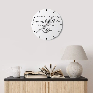 Hemmeligheden bag succes er et unikt vægur, der kombinerer minimalistisk design med et inspirerende budskab. Uret er dekoreret i et hvidt farveskema med den sorte indskrift "Bag enhver succesfuld person er der en masse kaffe" med røde accenter på viserne. Det passer perfekt ind i moderne interiører og bringer lethed og humor.