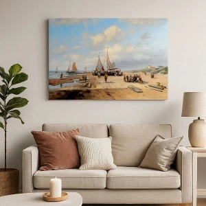 Lærredstryk - Billede på lærred - Fiskerbåde på stranden med menneskefigurer - 70x50cm - Efter en vellykket fangst - Moderne vægdekoration til stue og soveværelse ARTTOR