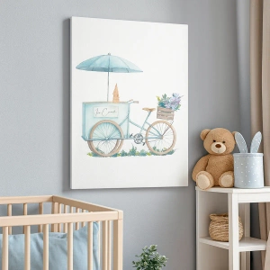 Maleriet "Søde sommerminder" er en charmerende komposition, der fremkalder nostalgiske minder om varme sommerdage. Det forestiller en cykel med is i en stilfuld vogn, dekoreret med en buket friske blomster og en paraply i pastelfarver. Hele værket er holdt i en delikat akvarelstil, hvilket giver værket en lethed og subtil charme.