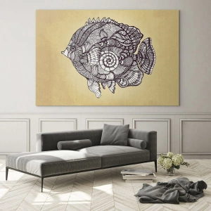 Billede på glas - En tegneseriefisk med ornamenter på en beige baggrund - 70x50cm - Fra et hav af ornamenter - Moderne vægdekoration til stue og soveværelse ARTTOR