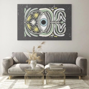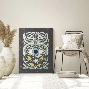 - En kunstnerisk komposition med et centralt øjesymbol omgivet af etniske mønstre på en sort baggrund. Dens stærke grafiske form og mystiske karakter skaber en moderne og udtryksfuld indretning.
