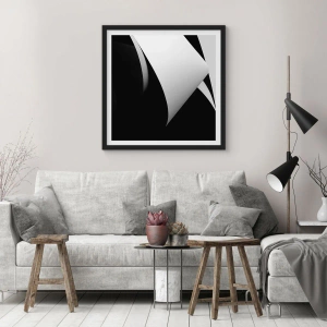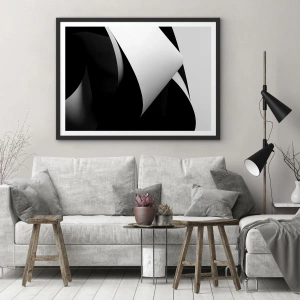 - Plakaten har en elegant sort-hvid komposition, hvor lys og skygge skaber abstrakte former. Det minimalistiske design og de geometriske former giver interiøret en moderne karakter.
