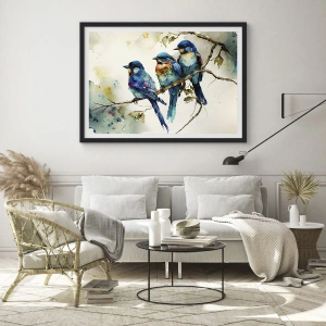 Plakat i sort ramme - Akvarelfugle på en gren i nuancer af blå og brun - 50x70cm - Er han fornærmet? - Moderne vægdekoration til stue og soveværelse ARTTOR