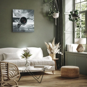 Vægur, Uret - Udsigt over motoren på et passagerfly på lufthavnens landingsbane - 30x30cm - Der er kraft! - Moderne vægdekoration til stue, køkken og soveværelse ARTTOR