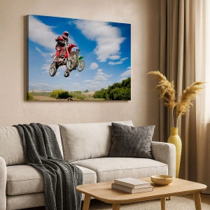 Lærredstryk - Billede på lærred - Ryttere på motocrosscykler i luften under et spring - 70x50cm - Himmelspring - Moderne vægdekoration til stue og soveværelse ARTTOR