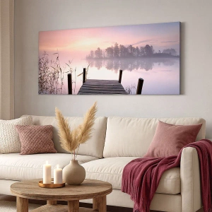 Lærredstryk - Billede på lærred - En mole ved søen ved daggry med tåge og en pastelfarvet himmel - 70x50cm - Ud af den lilla tåge... - Moderne vægdekoration til stue og soveværelse ARTTOR