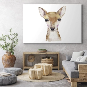 - Dette maleri har et diskret akvarelportræt af en ung hjort mod en hvid baggrund. Perfekt til at skabe en harmonisk atmosfære i moderne og minimalistiske interiører.
