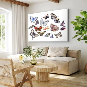 - Dette lærredstryk forestiller en samling farverige sommerfugle mod en hvid baggrund, der fremhæver naturens skønhed og formens subtilitet. Perfekt til elegante og lyse interiører.