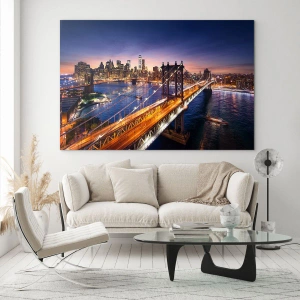 Maleriet er lavet af glas af højeste kvalitet, hvilket sikrer farvedybde og perfekt gengivelse af detaljer, såsom byens lys og broens struktur. Det er et ideelt valg for folk, der værdsætter moderne stil og unikke dekorative motiver.