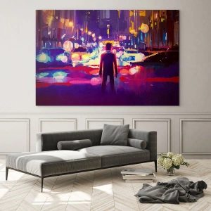 Billede på glas - En figur i et farverigt, futuristisk bynattelys - 70x50cm - Nedsænket i lys - Moderne vægdekoration til stue og soveværelse ARTTOR