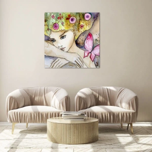 - Maleriet, der forestiller en melankolsk kvinde med en udsmykket frisure og en sommerfugl på skulderen, blev skabt ved hjælp af akvarelteknikker. Farverige detaljer og diskrete linjer giver det en unik, kunstnerisk karakter.