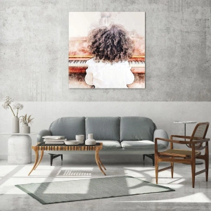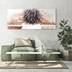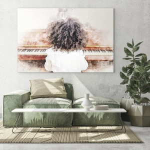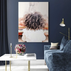 - Maleriet forestiller et barn med en krøllet manke, der sidder ved et klaver, gengivet i akvarelstil. Scenen udstråler varme, fred og en atmosfære af kreativitet og et barns passion for musik.