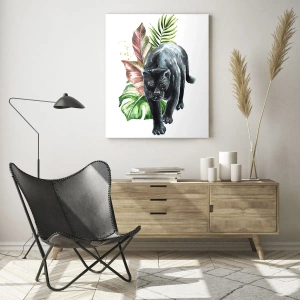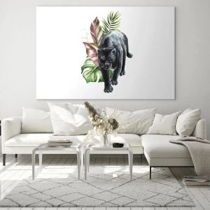 - En sort panter afbildet i akvarelstil mod en baggrund af farverige tropiske blade. Et eksotisk og dynamisk motiv i en dristig, men kunstnerisk komposition fuld af energi og natur.