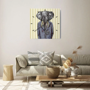 Vægur, Uret - En elegant tegning af en elefant i jakkesæt mod en baggrund af lodrette striber. - 30x30cm - Elegant af natur - Moderne vægdekoration til stue, køkken og soveværelse ARTTOR