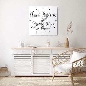 Den motiverende indskrift 'Tænk positivt, og positive ting vil ske' er hovedmotivet på dette unikke vægur. Uret er lavet på glas, der måler 30x30 cm, og kombinerer minimalisme og modernitet, hvilket tilføjer en inspirerende karakter til interiøret.
