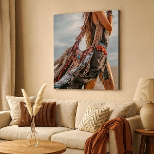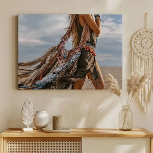Maleriets komposition skiller sig ud ved sine fine detaljer og den harmoniske kombination af boho elementer med et moderne udtryk. Fjerene og de dekorative smykker giver scenen en unik karakter og skaber en atmosfære af elegance og frihed. Det er den perfekte dekoration til en stue, et soveværelse eller et kontor, der beriger interiøret med et kunstnerisk præg.