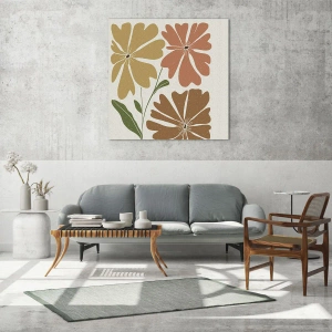 - Maleriet forestiller tre stiliserede blomster i nuancer af gul, brun og orange med grønne blade. Det overordnede design er minimalistisk med en dominerende lys baggrund og naturlige former. Det er en komposition fyldt med fred og harmoni.