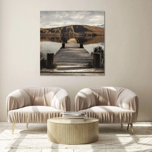 - Maleriet forestiller en træbro over en rolig sø med et bjerglandskab i baggrunden. Et landskab fyldt med ro og harmoni, perfekt til både moderne og rustikke interiører.