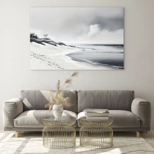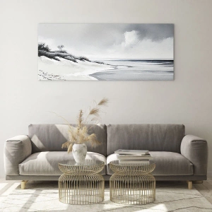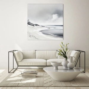 - Maleriet skildrer et roligt kystlandskab i sort-hvid. Den minimalistiske form og de afdæmpede farver skaber en stemningsfuld atmosfære og en følelse af ro.