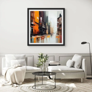 Plakat i sort ramme - Abstrakt bypanorama i grå og orange nuancer - 50x70cm - Regnfuld dag - Moderne vægdekoration til stue og soveværelse ARTTOR