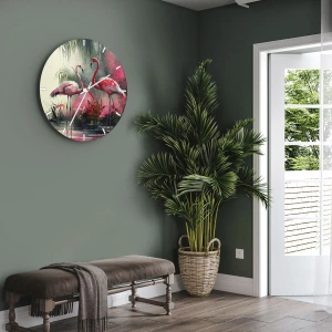 Vægur, Uret - To flamingoer i eksotiske, lyserøde omgivelser - 30x30cm - En lektion i naturlig charme - Moderne vægdekoration til stue, køkken og soveværelse ARTTOR