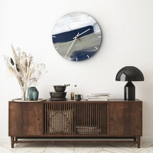 "Meeting with White" er et **moderne** vægur inspireret af abstrakt kunst, domineret af stærke penselstrøg i nuancer af **hvid** og **marineblå**. Kompositionen tiltrækker opmærksomhed med sin enkelhed og udtryksfuldhed.