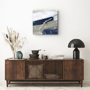 Vægur, Uret - Abstrakte penselstrøg i hvid og marineblå - 30x30cm - Møde med det hvide - Moderne vægdekoration til stue, køkken og soveværelse ARTTOR