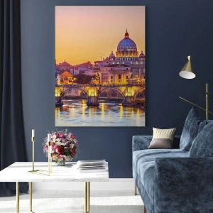 - Glasmaleriet forestiller et atmosfærisk panorama af Rom ved solnedgang. Broen og floden er synlige i forgrunden, og basilikaen, omgivet af byens lys, er i baggrunden, hvilket skaber en harmonisk og elegant komposition.