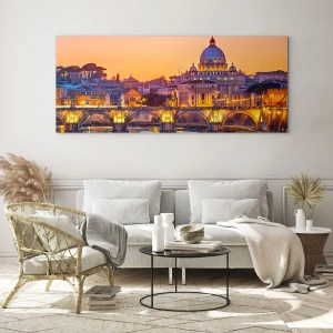 Billede på glas - Bro og basilika i Rom ved solnedgang - 70x50cm - Tusmørke over den evige by - Moderne vægdekoration til stue og soveværelse ARTTOR