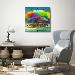 - Et vægur med et motiv af figurer mod en baggrund af farverige skyer og træsilhuetter, perfekt til interiører i en kunstnerisk og kreativ stil.