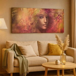- Maleriet forestiller et portræt af en kvinde omgivet af dynamiske, farverige former, der skaber en karakteristisk og energisk baggrund. Kombinationen af abstrakte former med portrættets delikatesse gør værket ideelt til moderne interiører.